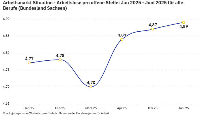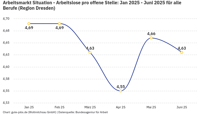 Speziell für deine gesuchte Arbeitsmarktregion können wir die gleiche Analyse durchführen wie für das Bundesland. Der Faktor für Dresden in Bezug auf das Verhältnis von Arbeitssuchenden je offener Stelle liegt bei 4,24. Das folgende Diagramm veranschaulicht die Entwicklung innerhalb der letzten sechs Monate: