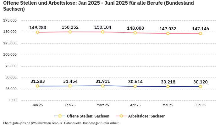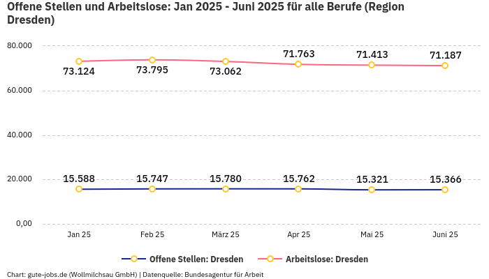Für eine grobe Einschätzung zu deinen Einstellungschancen macht es Sinn, sich vor Augen zu führen, wie die allgemeine Arbeitsmarktsituation 2025 in der Arbeitsmarktregion Dresden ausschaut. Hierbei stehen 16.291 offene Stellen, 69.088 Arbeitssuchende gegenüber. Daraus ergibt sich ein Faktor von 4,24. Zum Vergleich: im Bundesland Sachsen liegt der Faktor mit 31.084 offenen Stellen und 145.858 Arbeitssuchenden bei 4,69.