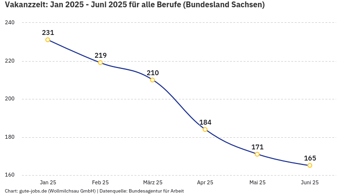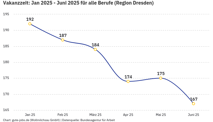 Was fehlt jetzt noch? Richtig, die Vakanzzeit! Wir erinnern uns: sie gibt die durchschnittliche Dauer für eine Stellenbesetzung an. In der Region Dresden liegt sie aktuell bei 154 Tagen. Scheinbar hat sich die Vakanzzeit im letzten halben Jahr um -7,78% verringert. Gut für Arbeitgeber, aber eher schlecht für Jobsuchende.