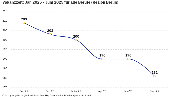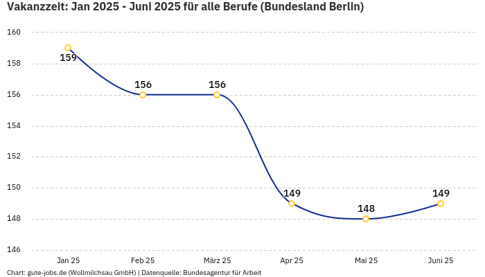 In Berlin beträgt die aktuelle Vakanzzeit 143 Tage. In ganz Deutschland beträgt die Vakanzzeit 203 und ist somit höher als die Vakanzzeit in Berlin. Das bedeutet, dass die Jobsuche in Berlin wiederum länger dauert als in den meisten anderen Bundesländern.