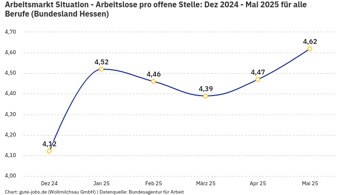 Für eine grobe Einschätzung zu deinen Einstellungschancen macht es Sinn, sich vor Augen zu führen, wie die allgemeine Arbeitsmarktsituation 2025 in der Arbeitsmarktregion Kassel ausschaut. Hierbei stehen 6.985 offene Stellen, 29.399 Arbeitssuchende gegenüber. Daraus ergibt sich ein Faktor von 4,21. Zum Vergleich: im Bundesland Hessen liegt der Faktor mit 43.012 offenen Stellen und 202.391 Arbeitssuchenden bei 4,71.