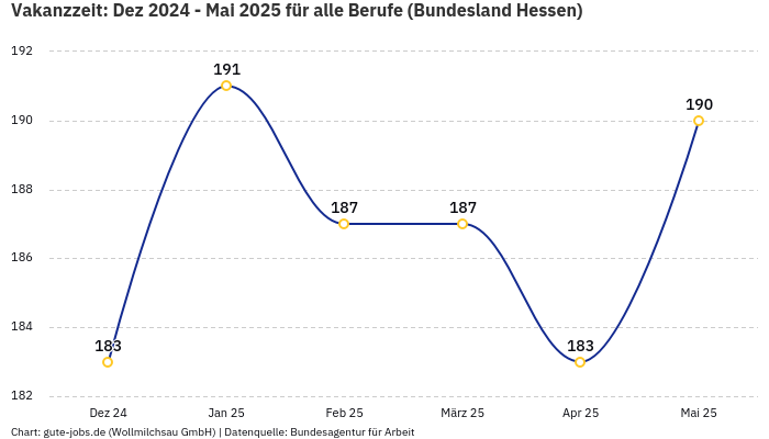 Im Bundesland Hessen liegt sie aktuell bei 184 Tagen im Mittel. Dabei hat sich die Vakanzzeit im vergangenen halben Jahr um -1,60% verringert. Scheinbar hat sich der Recruitingprozesss bei den Arbeitgebern verkürzt.