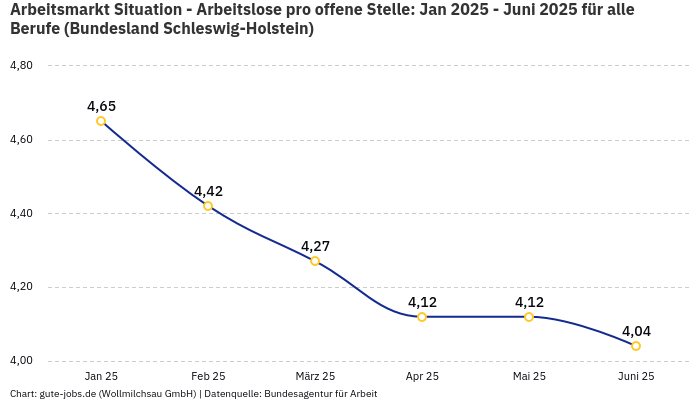 Offensichtlich hat sich das Verhältnis von Arbeitslosen pro offener Stelle in Schleswig-Holstein (Bundesland Ebene) in den letzten 6 Monaten vergrößert und zwar um 0,25%. Dies bedeutet, dass sich der Arbeitsmarkt aus der Sicht der Arbeitgeber im Durchschnitt verbessert hat. Es fällt tendenziell einfacher, Bewerber zu finden. Die Veränderung fällt allerdings mit unter +10% eher moderat aus. Man kann hier wohl kaum von einem starken Trend sprechen.