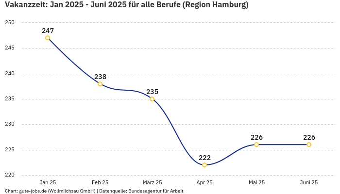 Um das Thema abzuschließen schauen wir uns noch die Vakanzzeit in der Region Hamburg an. Diese liegt dort bei 225 Tagen. Sie hat sich in den letzten 6 Monaten um -0,44% verkürzt. Eher gut für die Arbeitgeber.