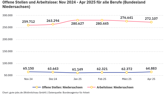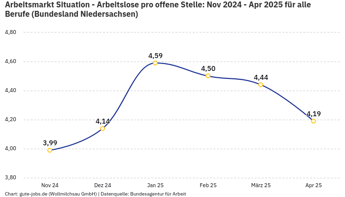 In Anbetracht der letzten sechs Monate gibt es gute Nachrichten für dich! Das Verhältnis von Arbeitslosen zu offenen Stellen hat sich in Niedersachsen um -1.18% verringert. Das heißt für dich, dass sich weniger Mitbewerber auf dem Arbeitsmarkt befinden. Sei dir trotzdem bewusst, dass wir von einer Änderungsrate von { bl_factor_6m_pc}}% von unter 10% sprechen. Eine hohe und aussagekräftige Änderung ist dementsprechend nicht wirklich festzustellen.