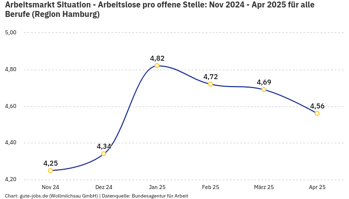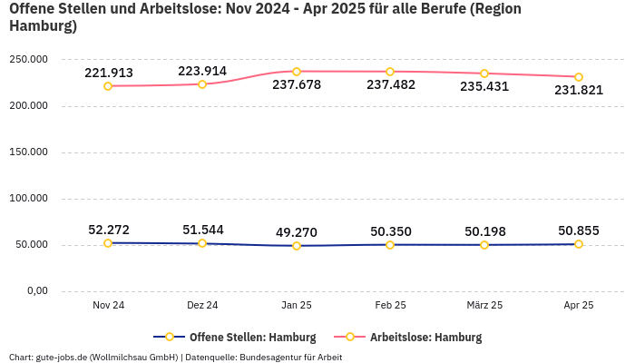 Für eine grobe Einschätzung zu deinen Einstellungschancen macht es Sinn, sich vor Augen zu führen, wie die allgemeine Arbeitsmarktsituation 2025 in der Arbeitsmarktregion Hamburg ausschaut. Hierbei stehen 49.252 offene Stellen, 227.662 Arbeitssuchende gegenüber. Daraus ergibt sich ein Faktor von 4,62. Zum Vergleich: im Bundesland Niedersachsen liegt der Faktor mit 63.404 offenen Stellen und 265.958 Arbeitssuchenden bei 4,19.