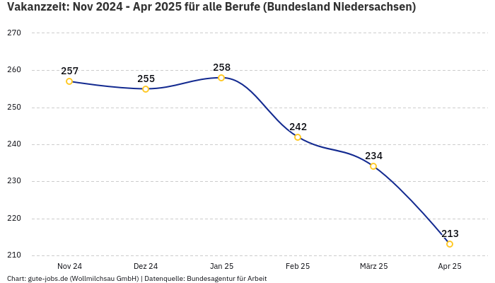 Im Bundesland Niedersachsen liegt sie aktuell bei 189 Tagen im Mittel. Dabei hat sich die Vakanzzeit im vergangenen halben Jahr um -2,07% verringert. Scheinbar hat sich der Recruitingprozesss bei den Arbeitgebern verkürzt.