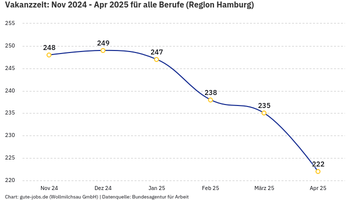 Um das Thema abzuschließen schauen wir uns noch die Vakanzzeit in der Region Hamburg an. Diese liegt dort bei 225 Tagen. Sie hat sich in den letzten 6 Monaten um -0,44% verkürzt. Eher gut für die Arbeitgeber.