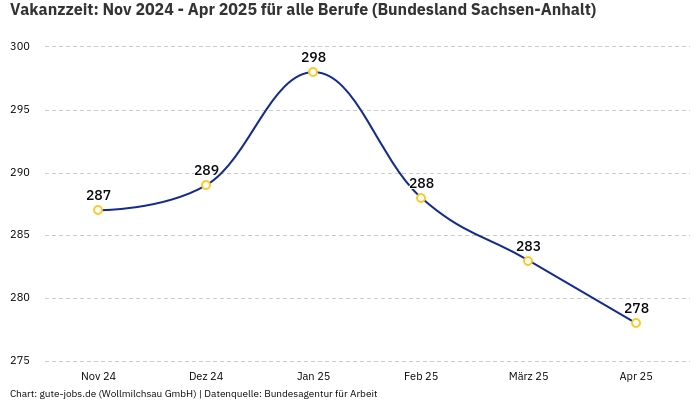Ein weiterer interessanter Wert in diesem Zusammenhang ist die durchschnittliche Vakanzzeit. Das ist die Zeit, die für die Besetzung einer Stelle aus der Sicht des Arbeitgebers durchschnittlich benötigt wird. Für das Bundesland Sachsen-Anhalt liegt sie aktuell bei durchschnittlich 263 Tagen. Und in den letzten 6 Monaten hat sich dieser Wert um -3% verringert. Die Besetzungen der offenen Stellen gehen schneller voran.