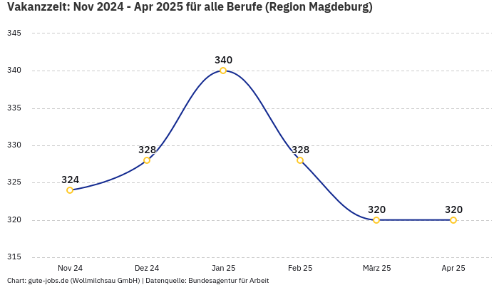 Was fehlt jetzt noch? Richtig, die Vakanzzeit! Wir erinnern uns: sie gibt die durchschnittliche Dauer für eine Stellenbesetzung an. In der Region Magdeburg liegt sie aktuell bei 322 Tagen. Scheinbar hat sich die Vakanzzeit im letzten halben Jahr um -0,31% verringert. Gut für Arbeitgeber, aber eher schlecht für Jobsuchende.