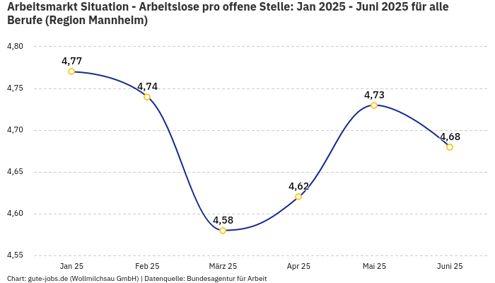Speziell für deine gesuchte Arbeitsmarktregion können wir die gleiche Analyse durchführen wie für das Bundesland. Der Faktor für Mannheim in Bezug auf das Verhältnis von Arbeitssuchenden je offener Stelle liegt bei 4,84. Das folgende Diagramm veranschaulicht die Entwicklung innerhalb der letzten sechs Monate: