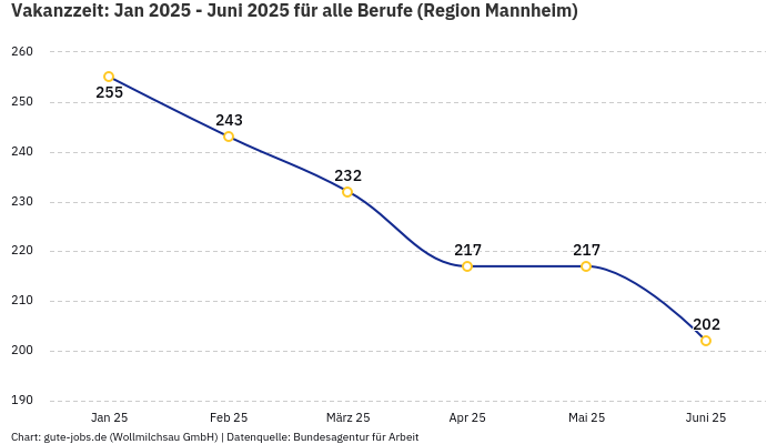 Was fehlt jetzt noch? Richtig, die Vakanzzeit! Wir erinnern uns: sie gibt die durchschnittliche Dauer für eine Stellenbesetzung an. In der Region Mannheim liegt sie aktuell bei 159 Tagen. Scheinbar hat sich die Vakanzzeit im letzten halben Jahr um -21,29% verringert. Gut für Arbeitgeber, aber eher schlecht für Jobsuchende.