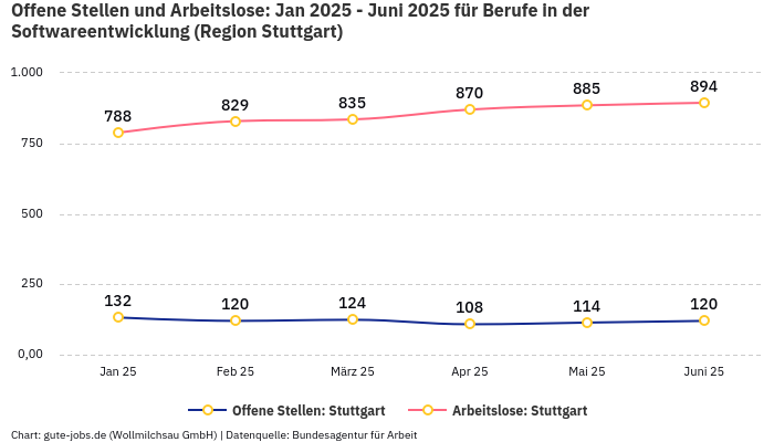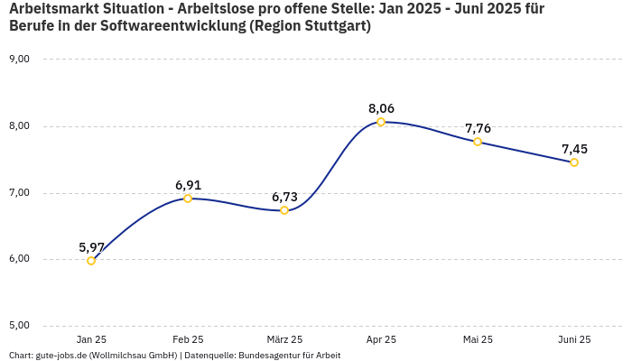 In der Arbeitsmarktregion Stuttgart, in welcher Dein Wunschort Stuttgart liegt, kommen in der Berufsgruppe “Berufe in der Softwareentwicklung” im Monat November statistisch gesehen 8,89 Arbeitslose auf eine offene Stelle. Diese statistische Größe ergibt sich aus 115 offenen Stellen und 1.022 registrierten Arbeitslosen bei der Bundesagentur für Arbeit.