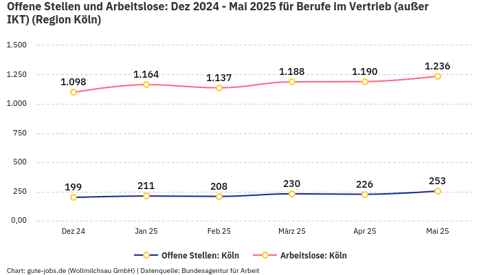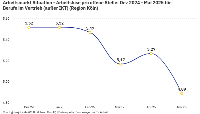 In der Arbeitsmarktregion Köln, in welcher der Ort Bonn liegt, in dem Du Deinem Wunschberuf nachgehen möchtest, verzeichnet die Statistik in der Berufsgruppe „Berufe im Vertrieb (außer IKT)” im Monat November 6,95 Arbeitslose auf eine offene Stelle. Diese statistische Größe berechnet sich aus 180 offenen Stellen und 1.251 registrierten Arbeitslosen bei der Bundesagentur für Arbeit.