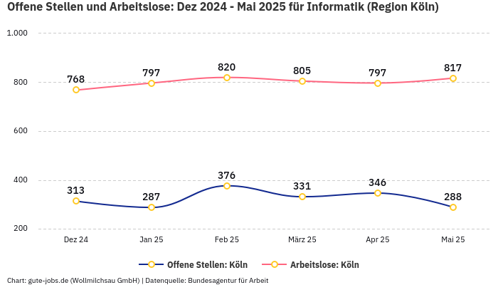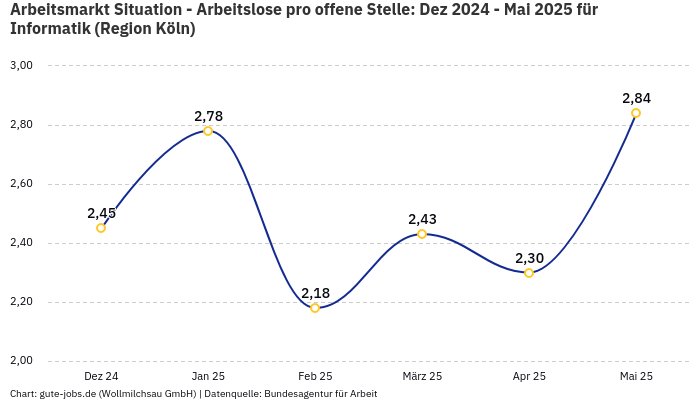 In der Arbeitsmarktregion Köln, in welcher Dein Wunschort Bonn liegt, kommen in der Berufsgruppe “Informatik” im Monat November statistisch gesehen 2,54 Arbeitslose auf eine offene Stelle. Diese statistische Größe ergibt sich aus 332 offenen Stellen und 844 registrierten Arbeitslosen bei der Bundesagentur für Arbeit.