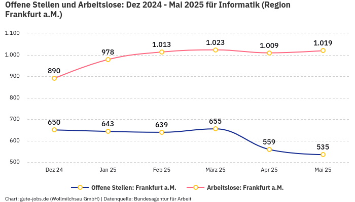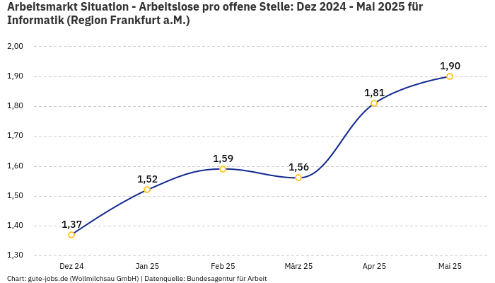 In der Arbeitsmarktregion Frankfurt a.M., in welcher der Ort Frankfurt (Main) liegt, in dem Du Deinem Wunschberuf nachgehen möchtest, verzeichnet die Statistik in der Berufsgruppe „Informatik” im Monat November 2,26 Arbeitslose auf eine offene Stelle. Diese statistische Größe berechnet sich aus 501 offenen Stellen und 1.133 registrierten Arbeitslosen bei der Bundesagentur für Arbeit.