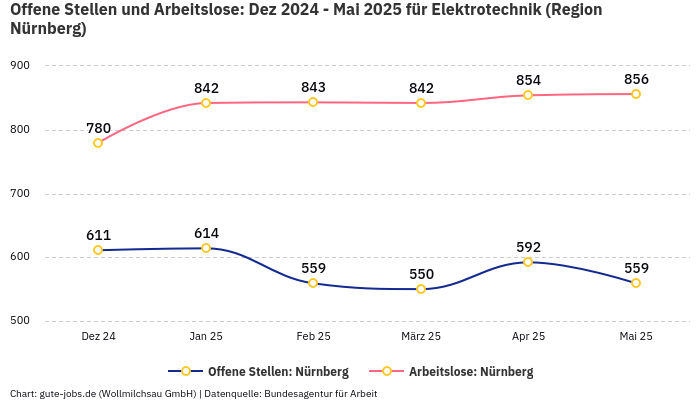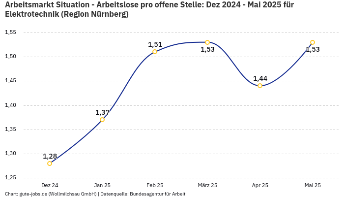 Für den Beruf Elektriker gibt es in unserer Jobbörse aktuell 2 offene Stellen. Die durchschnittliche Vakanzzeit, also der Zeitraum von der Veröffentlichung der Stellenanzeige bis zur endgültigen Einstellung, beträgt für die Arbeitsmarktregion Nürnberg 193 Tage.