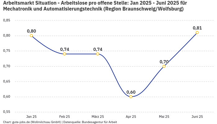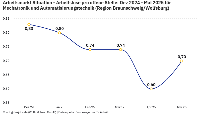 In der Arbeitsmarktregion Braunschweig/Wolfsburg, in welcher Dein Wunschort Braunschweig liegt, kommen in der Berufsgruppe “Mechatronik und Automatisierungstechnik” im Monat November statistisch gesehen 0,83 Arbeitslose auf eine offene Stelle. Diese statistische Größe ergibt sich aus 90 offenen Stellen und 75 registrierten Arbeitslosen bei der Bundesagentur für Arbeit.