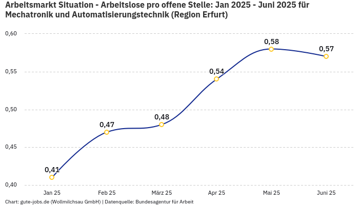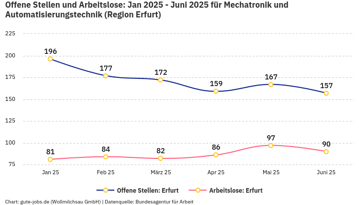 Im Bundesland Thüringen verzeichnet die Bundesagentur für Arbeit im November 2025 rund 2.813 beschäftigte und 111 arbeitslose Personen, in der Berufsuntergruppe “Mechatronik und Automatisierungstechnik”. Die “berufsspezifische” Beschäftigungsquote (Beschäftigte / (Arbeitslose+Beschäftigte)) beläuft sich damit auf 96,20%.