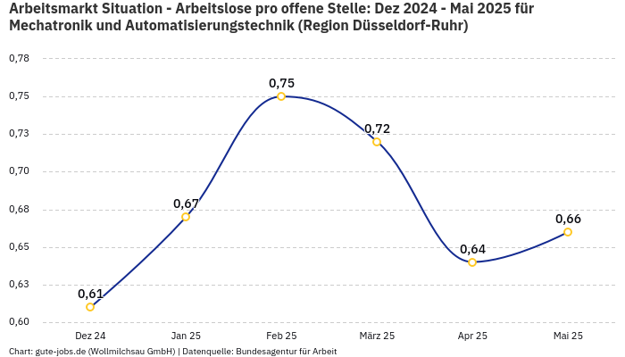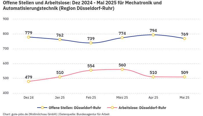 Im Bundesland Nordrhein-Westfalen verzeichnet die Bundesagentur für Arbeit im November 2025 rund 16.124 beschäftigte und 910 arbeitslose Personen, in der Berufsuntergruppe “Mechatronik und Automatisierungstechnik”. Die “berufsspezifische” Beschäftigungsquote (Beschäftigte / (Arbeitslose+Beschäftigte)) beläuft sich damit auf 94,66%.