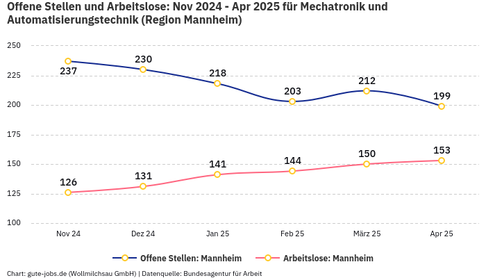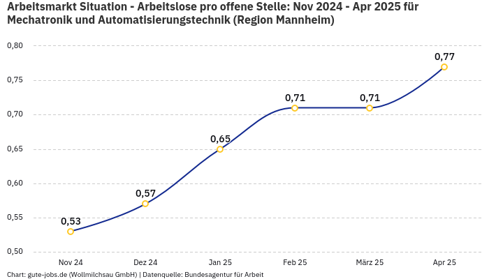 Im Bundesland Baden-Württemberg verzeichnet die Bundesagentur für Arbeit im November 2025 rund 15.222 beschäftigte und 724 arbeitslose Personen, in der Berufsuntergruppe “Mechatronik und Automatisierungstechnik”. Die “berufsspezifische” Beschäftigungsquote (Beschäftigte / (Arbeitslose+Beschäftigte)) beläuft sich damit auf 95,46%.