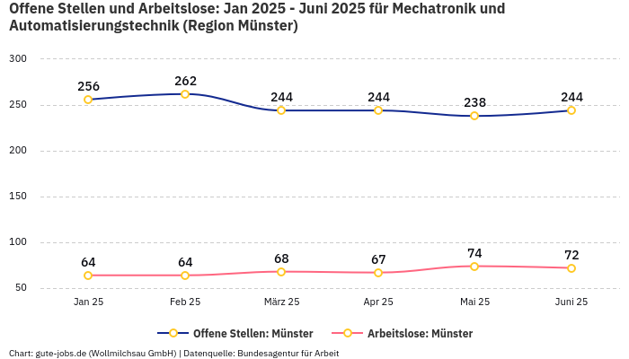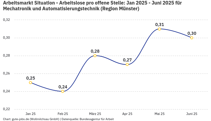 Im Bundesland Nordrhein-Westfalen verzeichnet die Bundesagentur für Arbeit im November 2025 rund 16.124 beschäftigte und 910 arbeitslose Personen, in der Berufsuntergruppe “Mechatronik und Automatisierungstechnik”. Die “berufsspezifische” Beschäftigungsquote (Beschäftigte / (Arbeitslose+Beschäftigte)) beläuft sich damit auf 94,66%.