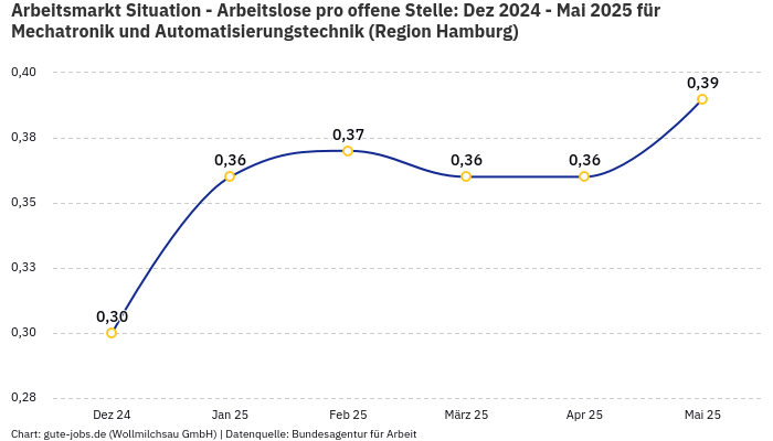 Auf der Bundeslandebene hat Mecklenburg-Vorpommern im November ca. 1.200 beschäftigte und 47 als arbeitslos gemeldete Personen in der Berufsuntergruppe “Mechatronik und Automatisierungstechnik”. Daraus lässt sich die “berufsspezifische” Beschäftigungsquote von ca. 96,23% errechnen.