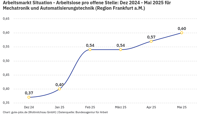 In der Arbeitsmarktregion Frankfurt a.M., in welcher der Ort Wetzlar liegt, in dem Du Deinem Wunschberuf nachgehen möchtest, verzeichnet die Statistik in der Berufsgruppe „Mechatronik und Automatisierungstechnik” im Monat November 0,59 Arbeitslose auf eine offene Stelle. Diese statistische Größe berechnet sich aus 548 offenen Stellen und 324 registrierten Arbeitslosen bei der Bundesagentur für Arbeit.