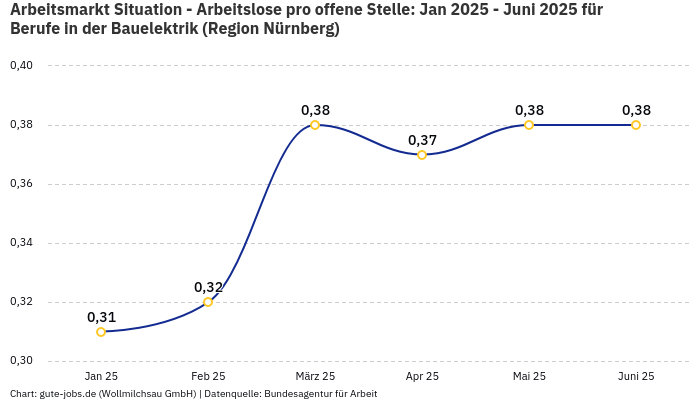 In dem Bundesland Bayern gab es im Monat November ca. 30.534 beschäftigte und 580 arbeitslose Personen, in der Berufsuntergruppe „Berufe in der Bauelektrik”. Die „berufsspezifische” Beschäftigungsquote (Beschäftigte / (Arbeitslose+Beschäftigte)) beträgt somit 98,14%.