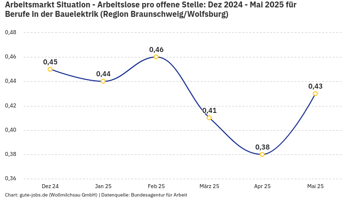 In der Arbeitsmarktregion Braunschweig/Wolfsburg, in welcher Dein Wunschort Braunschweig liegt, kommen in der Berufsgruppe “Berufe in der Bauelektrik” im Monat November statistisch gesehen 0,46 Arbeitslose auf eine offene Stelle. Diese statistische Größe ergibt sich aus 151 offenen Stellen und 69 registrierten Arbeitslosen bei der Bundesagentur für Arbeit.