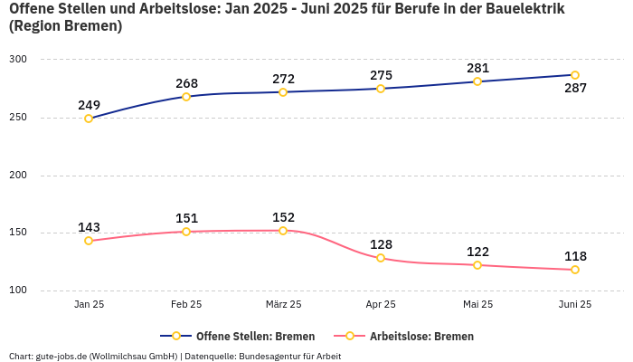 Offene Stellen und Arbeitslose: Juni 2025 - Nov 2025 | Für Berufe in der Bauelektrik | Region Bremen