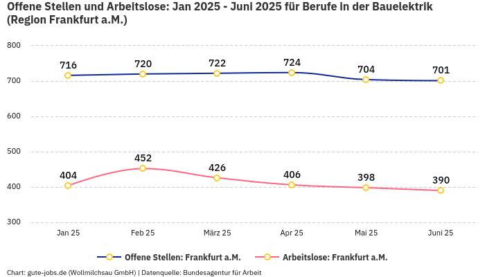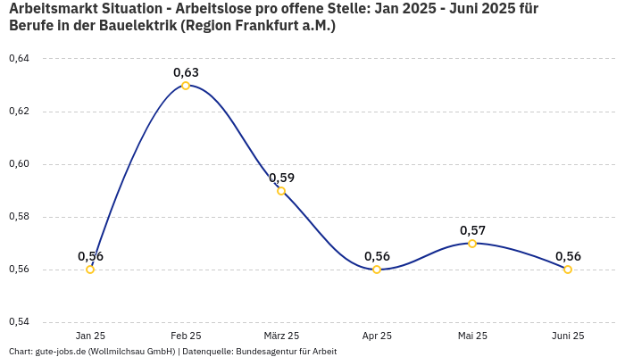 Wir verraten Dir, wie Deine Chancen auf eine erfolgreiche Bewerbung als Elektroniker Für Betriebstechnik in Frankfurt (Main) sind. Laut offiziellen Zahlen stehen in der Berufsgruppe “Berufe in der Bauelektrik” im Monat 428 registrierten Arbeitslosen bei der Bundesagentur für Arbeit 629 offene Jobs gegenüber. So kamen in der Arbeitsmarktregion Frankfurt a.M., in der Du einen neuen Job suchst, im November 2025 0,68 Arbeitslose auf eine offene Stelle.