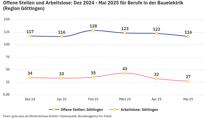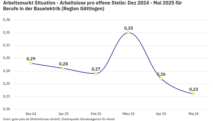 Im Bundesland Niedersachsen verzeichnet die Bundesagentur für Arbeit im November 2025 rund 19.812 beschäftigte und 485 arbeitslose Personen, in der Berufsuntergruppe “Berufe in der Bauelektrik”. Die “berufsspezifische” Beschäftigungsquote (Beschäftigte / (Arbeitslose+Beschäftigte)) beläuft sich damit auf 97,61%.