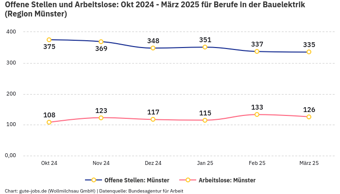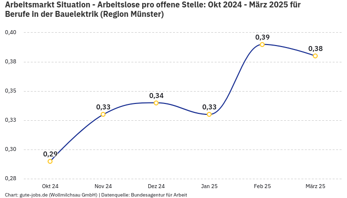 In der Arbeitsmarktregion Münster, in welcher der Ort Münster liegt, in dem Du Deinem Wunschberuf nachgehen möchtest, verzeichnet die Statistik in der Berufsgruppe „Berufe in der Bauelektrik” im Monat November 0,37 Arbeitslose auf eine offene Stelle. Diese statistische Größe berechnet sich aus 328 offenen Stellen und 122 registrierten Arbeitslosen bei der Bundesagentur für Arbeit.
