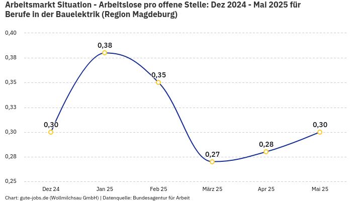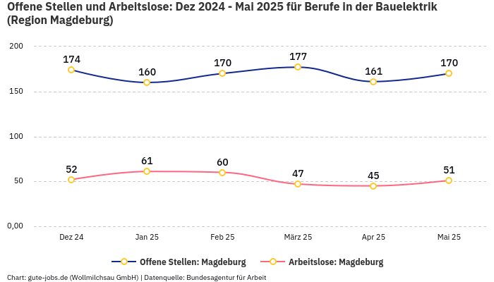 Du willst wissen, wie aussichtsreich Deine Suche als Elektroniker Für Betriebstechnik in Magdeburg ist? Laut Statistik „konkurrieren“ in der Berufsgruppe “Berufe in der Bauelektrik” im Monat 51 registrierte Arbeitslose bei der Bundesagentur für Arbeit um 157 offene Arbeitsplätze. So kommen in der Arbeitsmarktregion Magdeburg im Monat November 0,32 Arbeitslose auf eine offene Stelle.