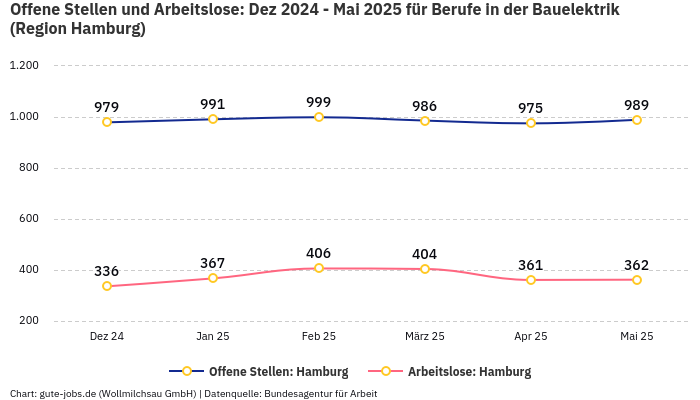 Wie genau sich die Situation in den letzten 6 Monaten auf dem Arbeitsmarkt Hamburg entwickelt haben, kannst Du aus folgender Grafik anhand von absoluten Zahlen der offenen Stellen und gemeldeten Arbeitslosen ablesen.