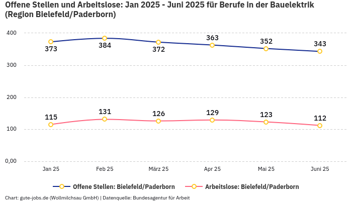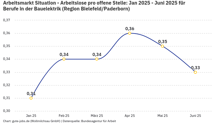 In der Arbeitsmarktregion Bielefeld/Paderborn, in welcher der Ort Paderborn liegt, in dem Du Deinem Wunschberuf nachgehen möchtest, verzeichnet die Statistik in der Berufsgruppe „Berufe in der Bauelektrik” im Monat November 0,33 Arbeitslose auf eine offene Stelle. Diese statistische Größe berechnet sich aus 340 offenen Stellen und 113 registrierten Arbeitslosen bei der Bundesagentur für Arbeit.