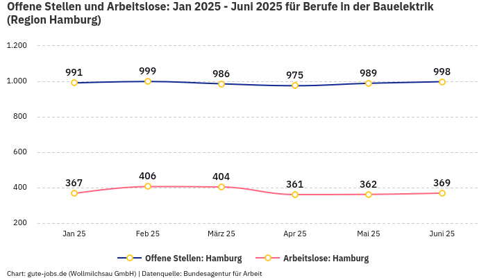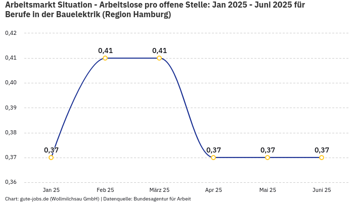 In der Arbeitsmarktregion Hamburg, in welcher Dein Wunschort Schwerin liegt, kommen in der Berufsgruppe “Berufe in der Bauelektrik” im Monat November statistisch gesehen 0,38 Arbeitslose auf eine offene Stelle. Diese statistische Größe ergibt sich aus 949 offenen Stellen und 364 registrierten Arbeitslosen bei der Bundesagentur für Arbeit.