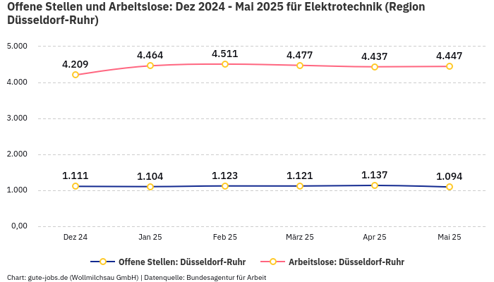 Wie genau sich die Situation in den letzten 6 Monaten auf dem Arbeitsmarkt Düsseldorf-Ruhr entwickelt haben, kannst Du aus folgender Grafik anhand von absoluten Zahlen der offenen Stellen und gemeldeten Arbeitslosen ablesen.