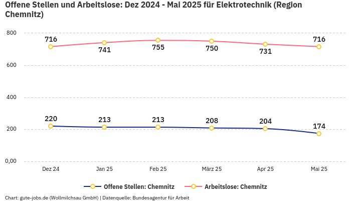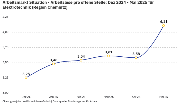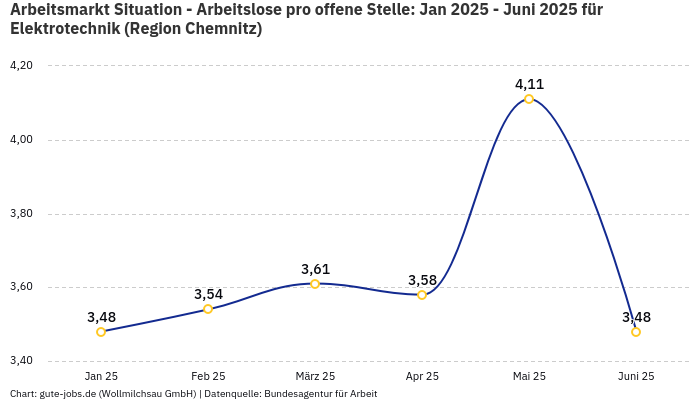Im Bundesland Sachsen verzeichnet die Bundesagentur für Arbeit im November 2025 rund 20.295 beschäftigte und 1.654 arbeitslose Personen, in der Berufsuntergruppe “Elektrotechnik”. Die “berufsspezifische” Beschäftigungsquote (Beschäftigte / (Arbeitslose+Beschäftigte)) beläuft sich damit auf 92,46%.