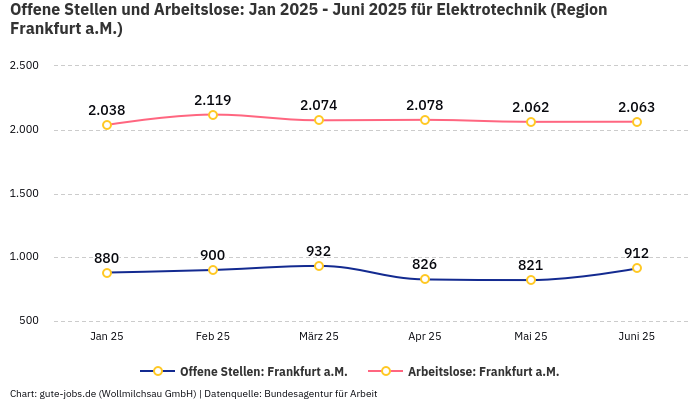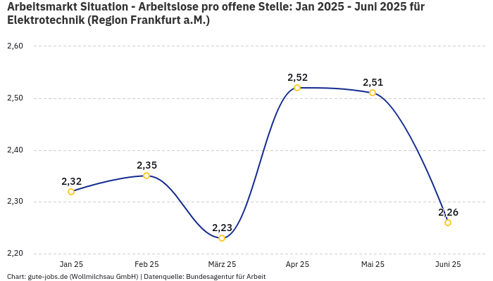 In der Arbeitsmarktregion Frankfurt a.M., in welcher Dein Wunschort Frankfurt (Main) liegt, kommen in der Berufsgruppe “Elektrotechnik” im Monat November statistisch gesehen 2,30 Arbeitslose auf eine offene Stelle. Diese statistische Größe ergibt sich aus 906 offenen Stellen und 2.084 registrierten Arbeitslosen bei der Bundesagentur für Arbeit.