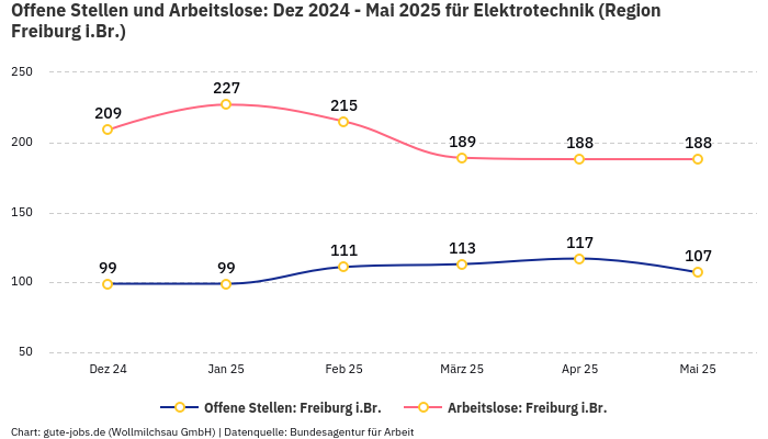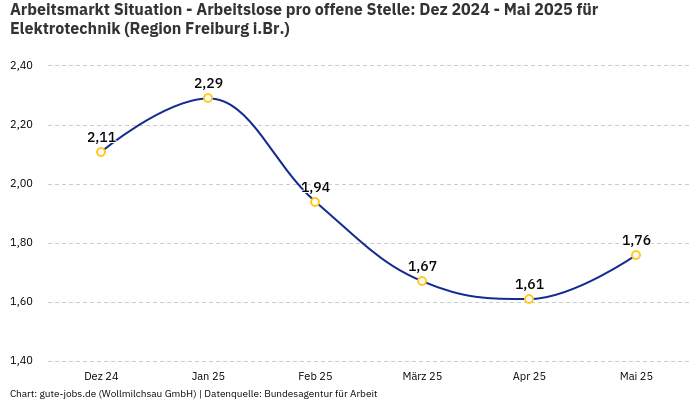 Wir verraten Dir, wie Deine Chancen auf eine erfolgreiche Bewerbung als Ingenieur Elektrotechnik in Freiburg (Breisgau) sind. Laut offiziellen Zahlen stehen in der Berufsgruppe “Elektrotechnik” im Monat 214 registrierten Arbeitslosen bei der Bundesagentur für Arbeit 122 offene Jobs gegenüber. So kamen in der Arbeitsmarktregion Freiburg i.Br., in der Du einen neuen Job suchst, im November 2025 1,75 Arbeitslose auf eine offene Stelle.