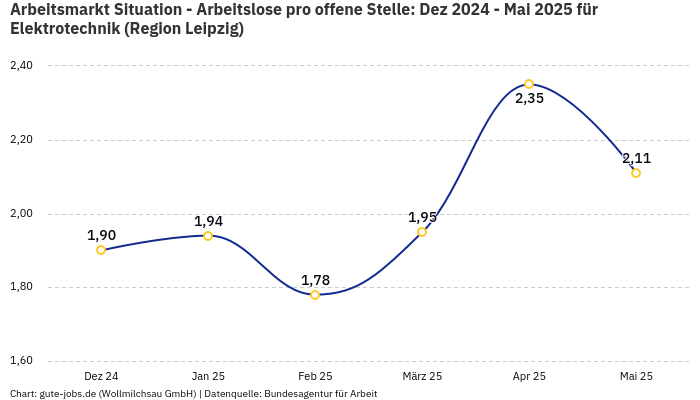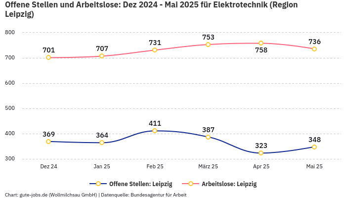 Im Bundesland Sachsen verzeichnet die Bundesagentur für Arbeit im November 2025 rund 20.295 beschäftigte und 1.654 arbeitslose Personen, in der Berufsuntergruppe “Elektrotechnik”. Die “berufsspezifische” Beschäftigungsquote (Beschäftigte / (Arbeitslose+Beschäftigte)) beläuft sich damit auf 92,46%.