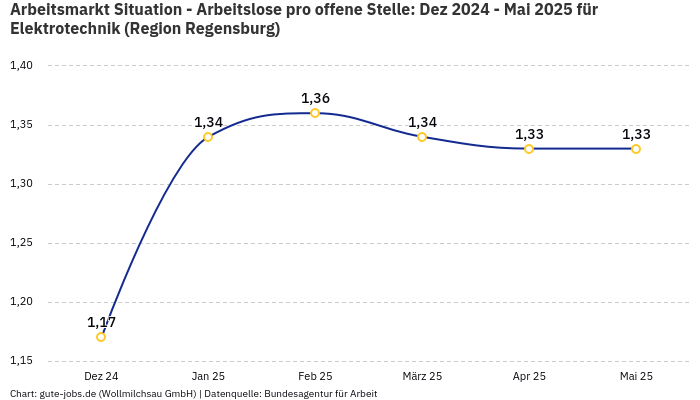 Du willst wissen, wie aussichtsreich Deine Suche als Ingenieur Elektrotechnik in Regensburg ist? Laut Statistik „konkurrieren“ in der Berufsgruppe “Elektrotechnik” im Monat 273 registrierte Arbeitslose bei der Bundesagentur für Arbeit um 170 offene Jobs. So kommen in der Arbeitsmarktregion Regensburg im Monat November 1,61 Arbeitslose auf eine offene Stelle.