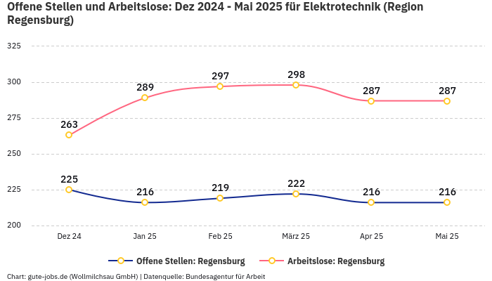 Für den Beruf Ingenieur Elektrotechnik gibt es in unserer Jobbörse aktuell 6 offene Stellen. Die durchschnittliche Vakanzzeit, also der Zeitraum von der Veröffentlichung der Stellenanzeige bis zur endgültigen Einstellung, beträgt für die Arbeitsmarktregion Regensburg 303 Tage.