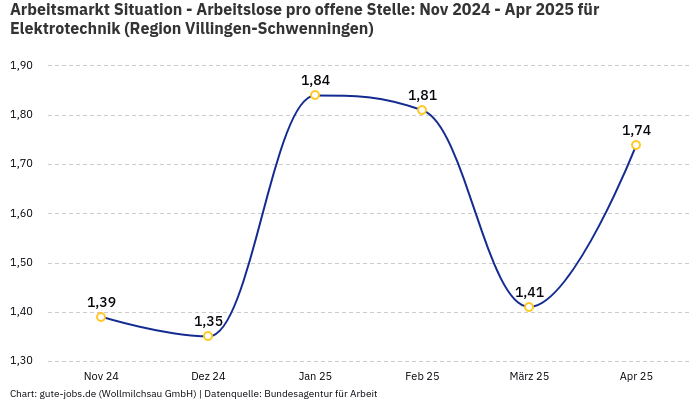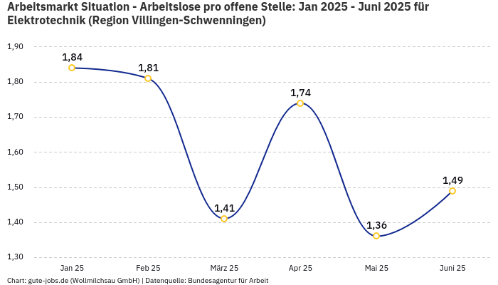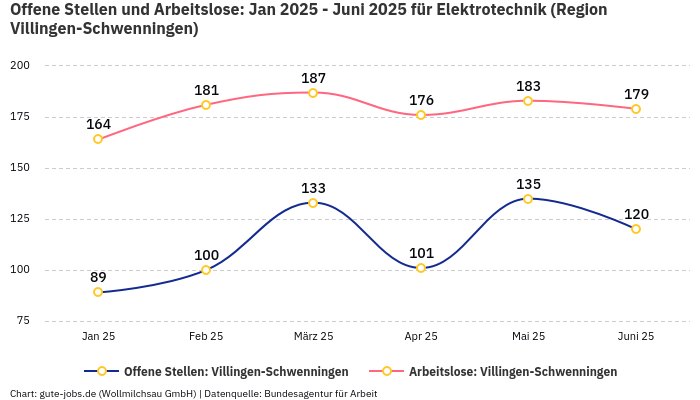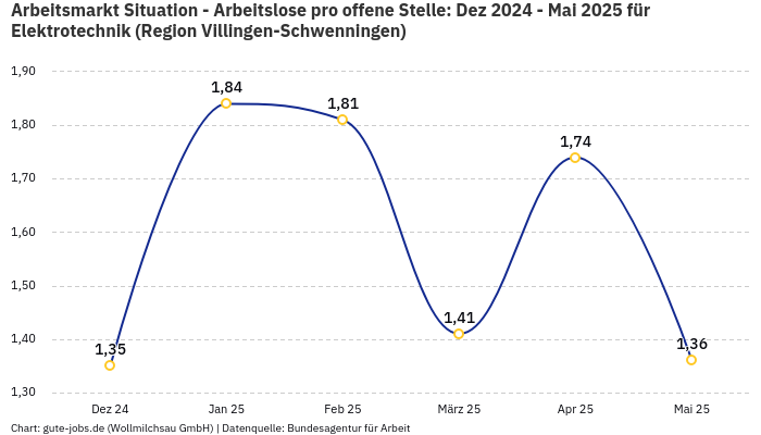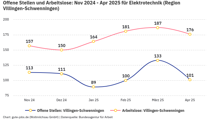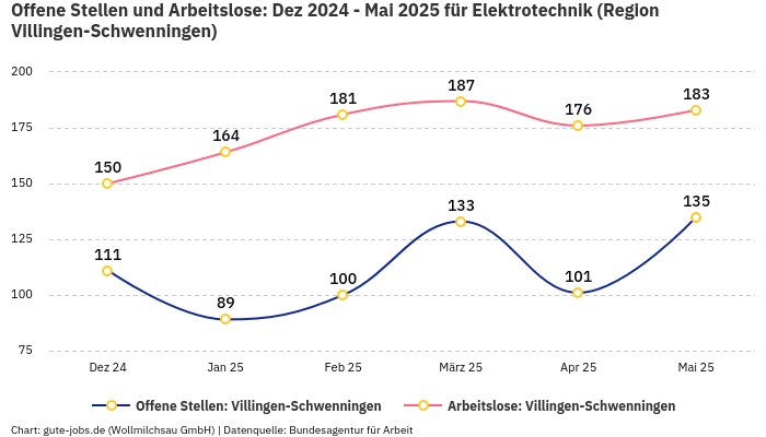 Für den Beruf Ingenieur Elektrotechnik gibt es in unserer Jobbörse aktuell 1 offene Stellen. Die durchschnittliche Vakanzzeit, also der Zeitraum von der Veröffentlichung der Stellenanzeige bis zur endgültigen Einstellung, beträgt für die Arbeitsmarktregion Villingen-Schwenningen 149 Tage.