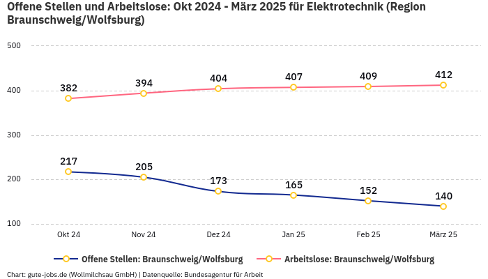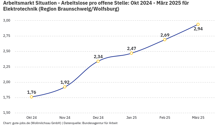 In der Arbeitsmarktregion Braunschweig/Wolfsburg, in welcher Dein Wunschort Wolfsburg liegt, kommen in der Berufsgruppe “Elektrotechnik” im Monat November statistisch gesehen 3,06 Arbeitslose auf eine offene Stelle. Diese statistische Größe ergibt sich aus 136 offenen Stellen und 416 registrierten Arbeitslosen bei der Bundesagentur für Arbeit.