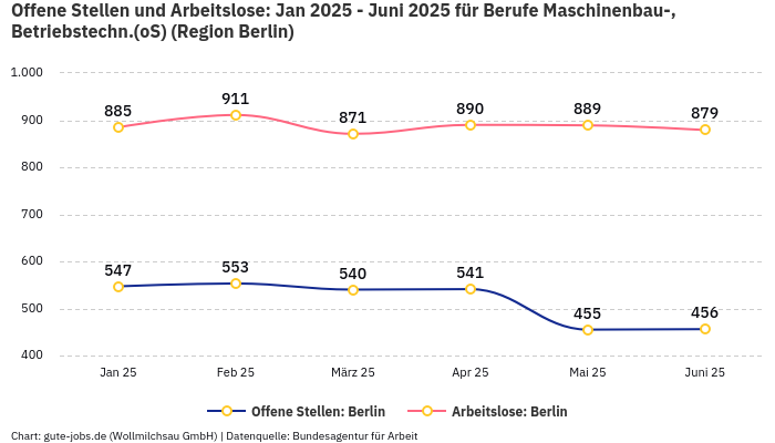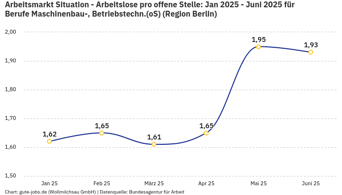 In der Arbeitsmarktregion Berlin, in welcher Dein Wunschort Berlin liegt, kommen in der Berufsgruppe “Berufe Maschinenbau-, Betriebstechn.(oS)” im Monat November statistisch gesehen 1,52 Arbeitslose auf eine offene Stelle. Diese statistische Größe ergibt sich aus 549 offenen Stellen und 836 registrierten Arbeitslosen bei der Bundesagentur für Arbeit.