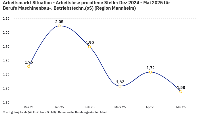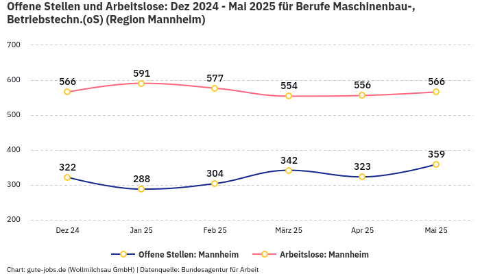 In der Arbeitsmarktregion Mannheim, in welcher der Ort Ludwigshafen (Rhein) liegt, in dem Du Deinem Wunschberuf nachgehen möchtest, verzeichnet die Statistik in der Berufsgruppe „Berufe Maschinenbau-, Betriebstechn.(oS)” im Monat November 1,65 Arbeitslose auf eine offene Stelle. Diese statistische Größe berechnet sich aus 340 offenen Stellen und 560 registrierten Arbeitslosen bei der Bundesagentur für Arbeit.