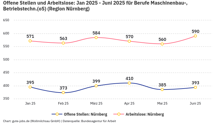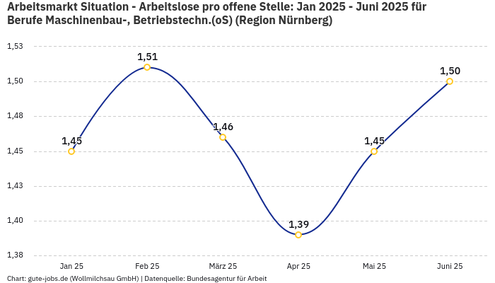 Für die Stelle als Ingenieur Maschinenbau sind in unserer Jobdatenbank derzeit 5 offene Stellen verzeichnet. In der Arbeitsmarktregion Nürnberg, in der Du suchst, dauert es im Durchschnitt 154 Tage, ehe eine Stelle in diesem Bereich besetzt werden kann.